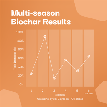 This trial alternates between soybean and chickpea each season. Even though full plots couldn’t be harvested this year due to weather constraints, yield estimates based on plant samples reinforce the pattern observed over six consecutive cropping cycles: biochar-treated plots consistently outperform controls, with yield increases ranging from 15% to over 100%.